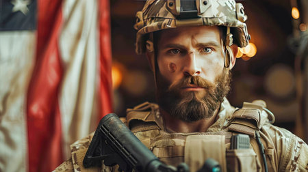 Close-up of a veteran wearing a camouflage uniform and American flag, symbolizing patriotism, military service, and sacrifice