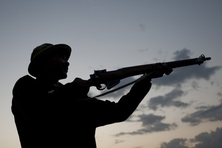 Silhouette of a soldier with a rifle in the mountains at sunset