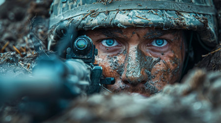 The close up picture of the military officer is working on the operation in the warfare or battlefield, the military require skill like endurance, training, physical strength and combat skill. AIG43.