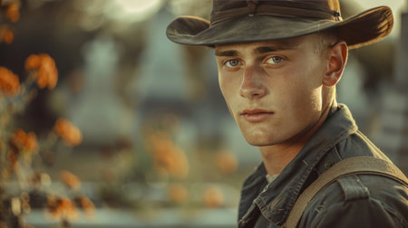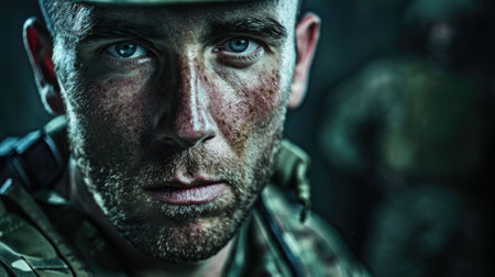 A soldier stares intensely into the distance with a determined expression, surrounded by a wartime environment while the sunlight illuminates his face, highlighting his features.