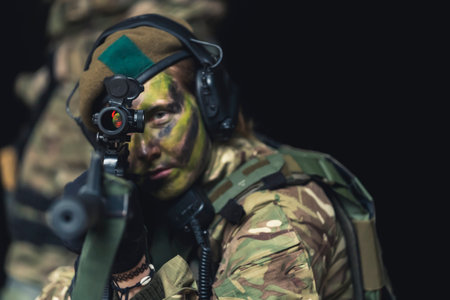 Courageous click pro soldier passionately aiming a rifle . High quality photo