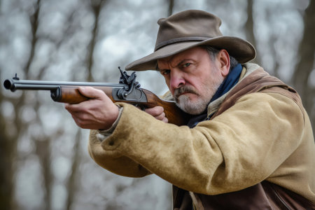 Hunter wearing a vintage hat and jacket, aiming intently with an antique rifle amidst the serene beauty of a forest