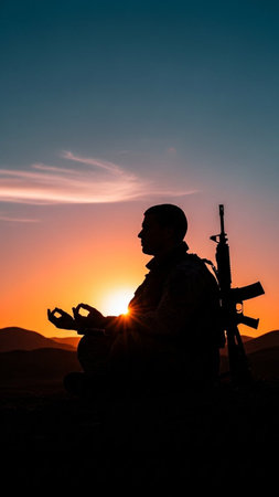 Male soldier in camouflage uniform saluting with a sunset backdrop, highlighting strength and dedication, capturing the essence of military service and honor