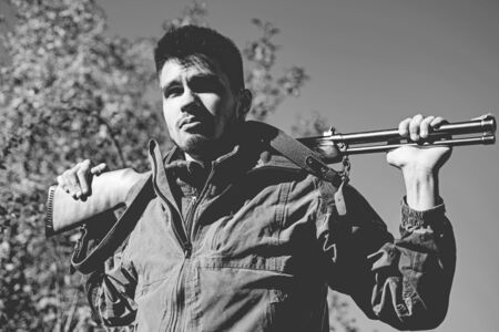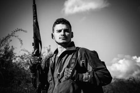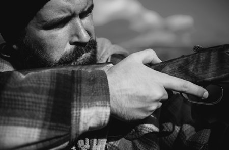 Close up Portrait of hamdsome Hunter. Poacher with Rifle Spotting Some Deers. Illegal Hunting Poacher in the Forest. Hunter with shotgun gun on hunt.