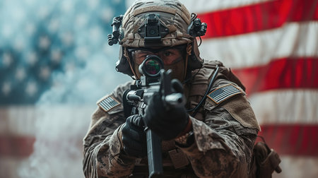 rangers during the military operation. anti terrorism military concept. The American military on the background of the star-spangled American flag. The concept of homeland protection and patriotism.