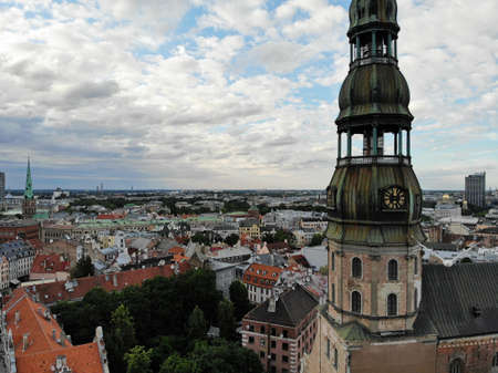 Aerial view of the bell tower of St. Peter's Cathedral in Riga, Latvia.