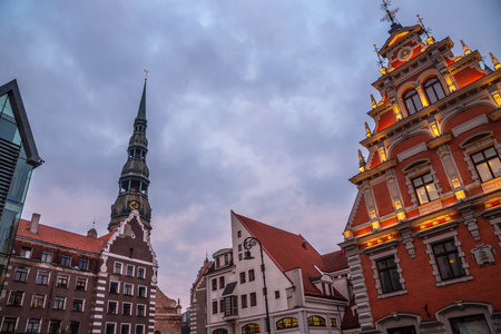 Historic center of Riga with old and modern buildings in the evening, Latvia