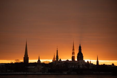 A beautiful, colorful sunrise landscape with city centre building silhouette against bright morning sky. A winter lansdcape with frozen river Daugava in Latvia capital Riga.