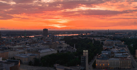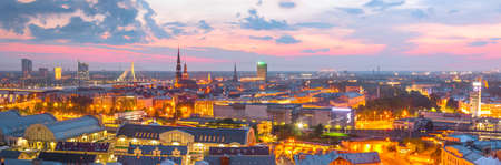 Aerial panoramic sunset over Riga old town in Latvia.