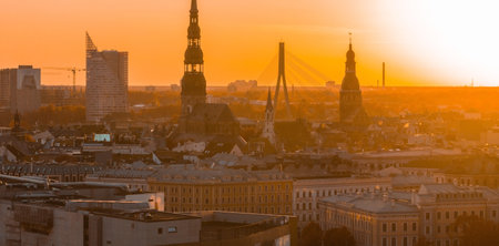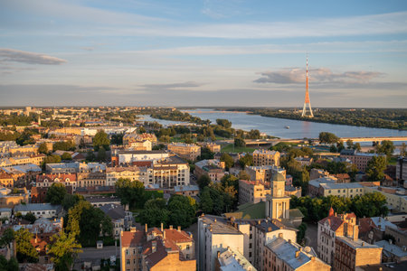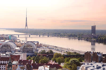 RIga rooftop view panorama at sunset with urban architectures and Daugava River.