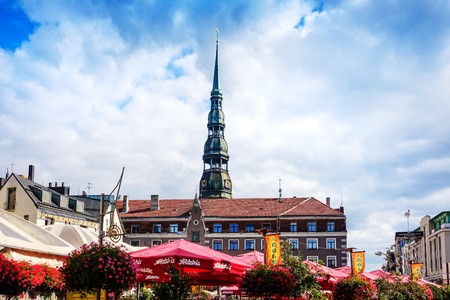 Square in the center of old Riga with old buildings, cafe and view of the medieval cathedral St. Peter's Church.
