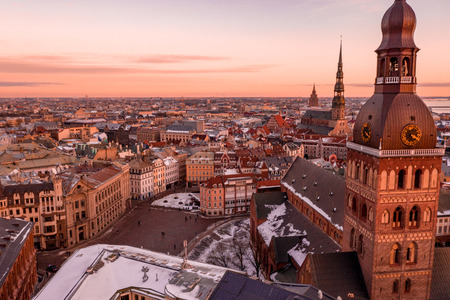 Beautiful Riga city panorama in winter with snow covered houses, churches and streets. Aerial morning view. Winter city scenery in Riga, Latvia.