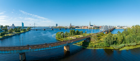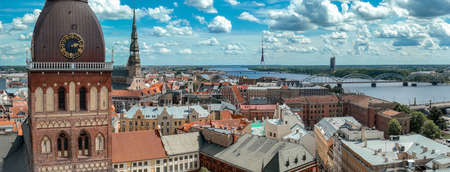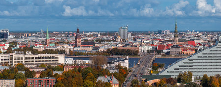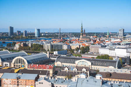 Riga, Latvia - September 19 2021: Riga panorama with St. Peter's Church and other churches and buildings, Daugava river, bridge, financial district and Central Market