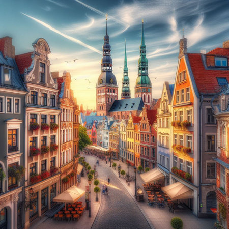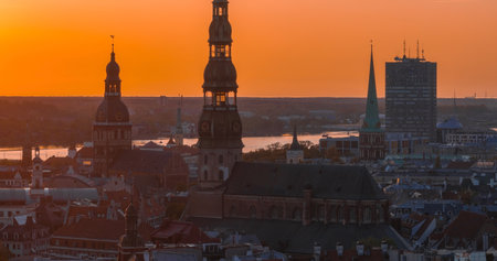 Sunrise Over Rigas Old Town with St. Peters Church and Cathedral