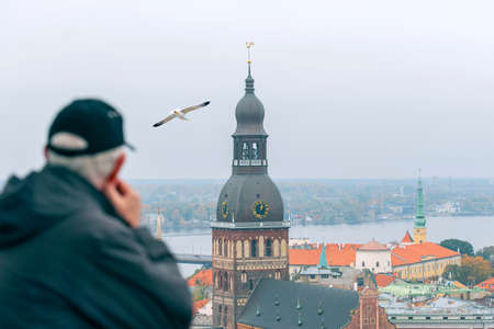 A man, tourist at point view, panorama of Riga and Riga Cathedral on Dome Square during autumn day, Latvia