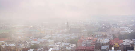 Lviv, Ukraine- September 1, 2018: Foggy Morning of the City Center from Town Hall Tower. The Bernardine Church and Monastery in Lviv