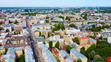 Aerial view from above on the great baltic city Riga. The capital of Latvia. One of the most beautiful and autentic city in Europe. A place you wnt to come back. Created by drone.