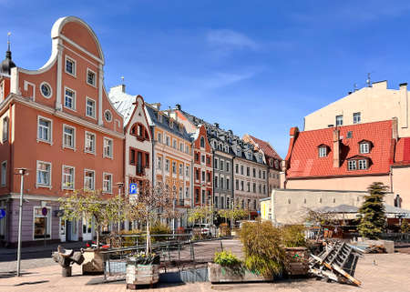 LATVIA, RIGA, MARCH, 2022 - Veranda of open-air cafe is preparing for the summer season among ancient gothic architecture near the Town Hall Square in Riga Old Town, capital of Latvia.