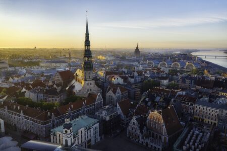 Beautiful aerial Riga view from above with golden rooster on the top of the St. Peters church and old town of Vecriga.