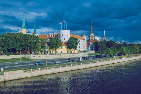 View of beach on the Daugava river and old town of Riga, Riga castle and bridge over the Daugava River in Riga city, Latvia.