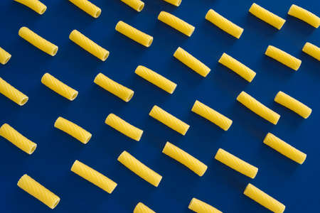 Heap of uncooked macaroni on blue background food and drink concept.