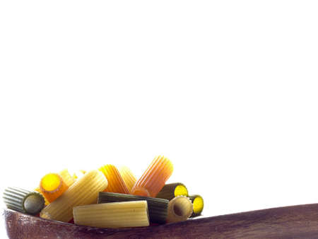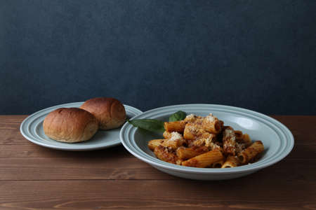 rigatoni pasta italian food and whole grain bread closeup isolated on table