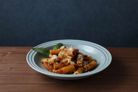 Top view of Italian pasta rigatoni with bolognese sauce, on a rustic wooden background. Top view