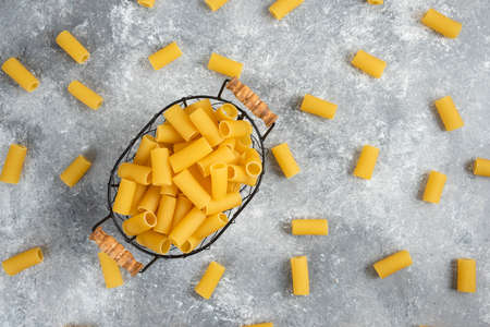 Penne pasta in a metallic container on grey marble background