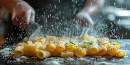 close up of italian pasta with flour and olive oil splashes
