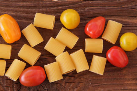 Raw Penne Pasta with colorful tomatoes on wooden table