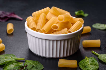close up of uncooked italian rigatoni pasta