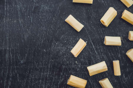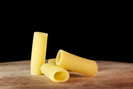 Rigatoni pasta or tube shaped pasta over wooden background