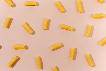 Uncooked rigatoni pasta scattered on a pink background