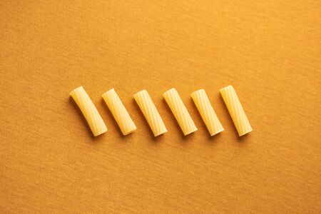 Rigatonis arranged in a row with orange background and soft light