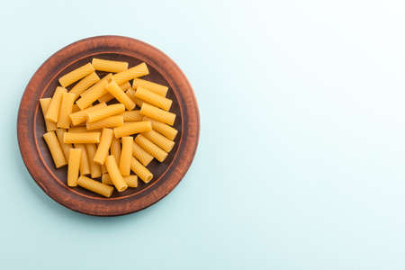 Italian food concept. Pasta Tortiglioni on light blue background with copy space