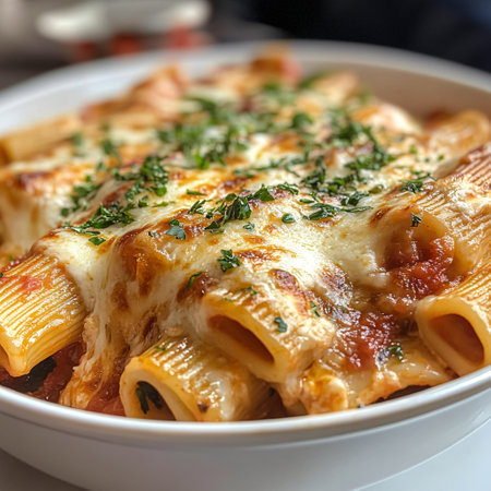 A hearty dish of baked rigatoni pasta topped with melted cheese and fresh herbs sits in a white bowl, ready to be enjoyed. The meal radiates warmth, inviting food lovers to savor every bite.