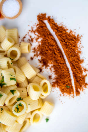 Hard pasta made from wheat flour, typical food from Italy, with great calorific value and high content of fast absorbing carbohydrates.