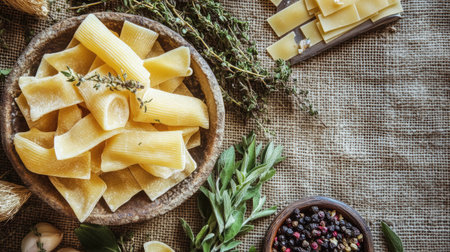 Discover the beauty of freshly made pasta sheets surrounded by herbs and spices on a rustic table, perfect for culinary creations and Italian food inspiration.
