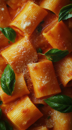 A close view of cooked rigatoni pasta immersed in rich tomato sauce, garnished with fresh basil leaves and sprinkled with gratified cheese. The warm colors and textures create an inviting dish.