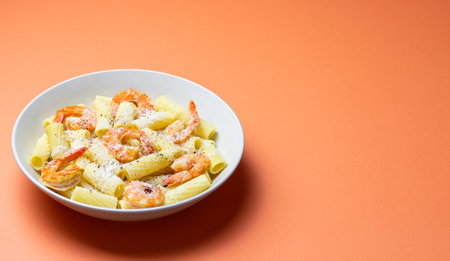 Pasta in a creamy sauce with shrimp and cheese. Seafood. Italian cuisine