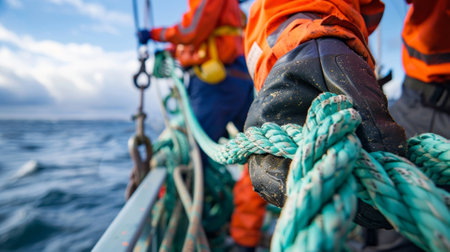 A sailor skillfully tying knots on ropes and rigging demonstrating seamanship and expertise in maritime skills