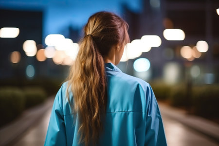 Rear view of female nurse in blue scrubs walking away from camera on city street at night. Concepts of healthcare, exhaustion, and frontline workers.