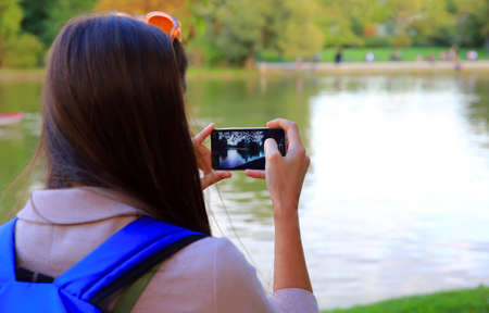 Young woman photographing on the phone in park