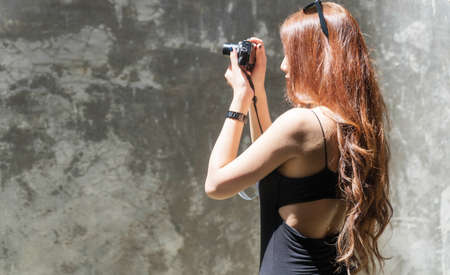 Cropped shot woman having fun in garden with camera travel photo of photographer.