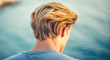 Serene Moment: Rear View of a Person with Blonde Hair by the Ocean.
