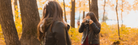 Banner Child taking picture her mother on retro camera in autumn park. Hobbies and leisure concept. Copy space