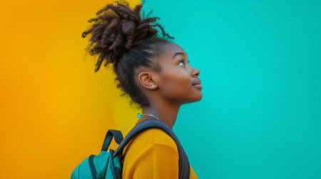 Young African American girl with a backpack looking up in wonder against a colorful background