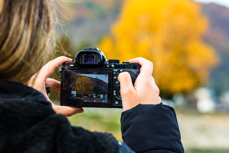 Traveler photographing scenic view in forest. One caucasian woman shooting close up look. Girl take photo video on dslr mirrorless camera.