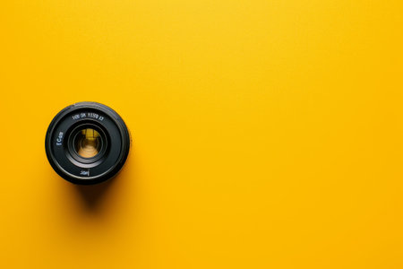 Close-up of an wide angle camera lens with glass reflections on yellow background
