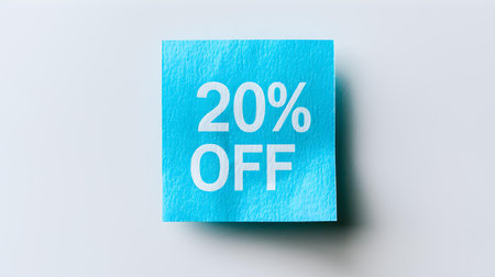 White '20% OFF' Text on a Cyan Square Paper Note. White background with copy space